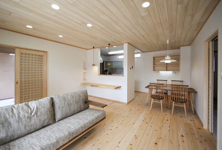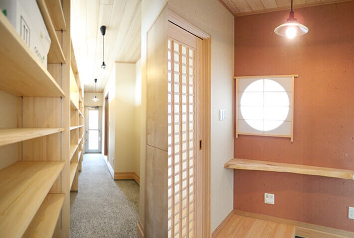 漆喰と本焼杉のコントラストが目映い外観が特徴的なお宅です。家に入れば、彩り豊かな生活をサポートするこだわりの通り土間が眼前に広がります。