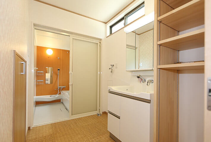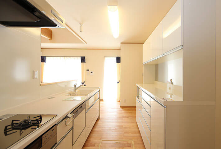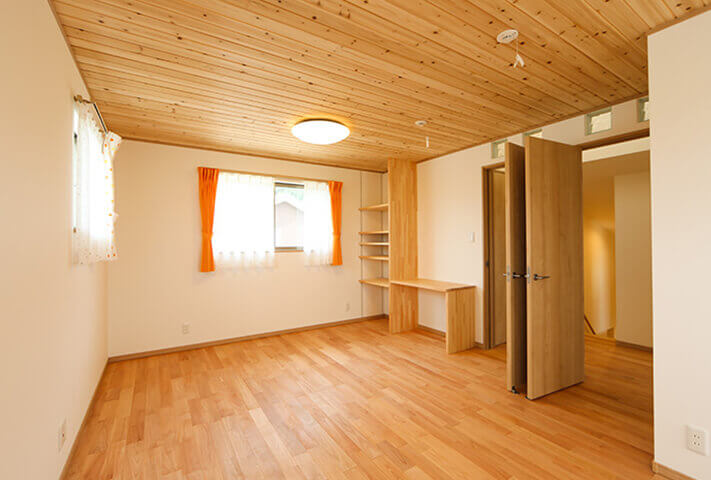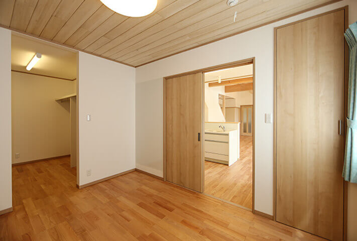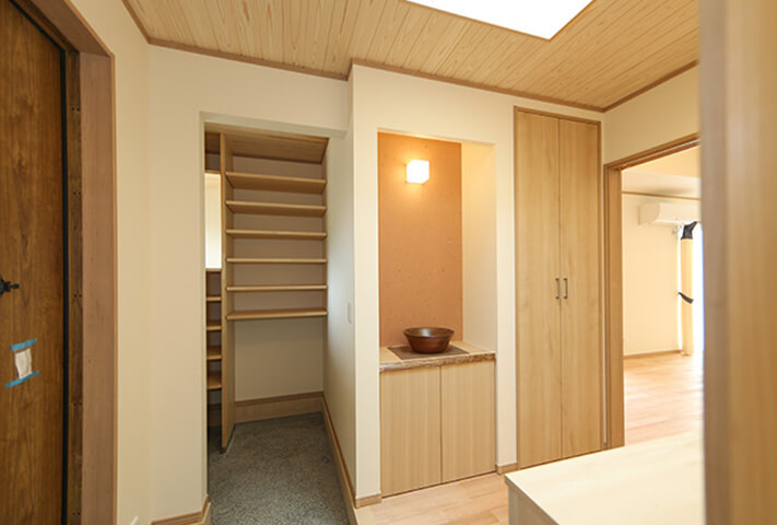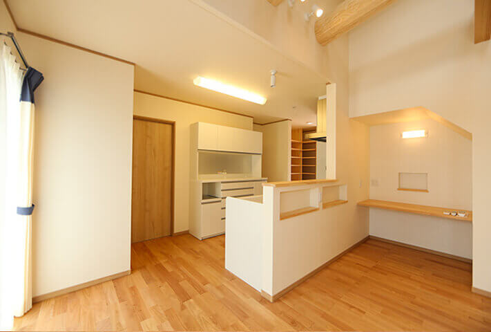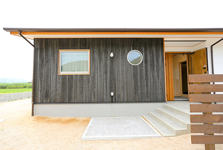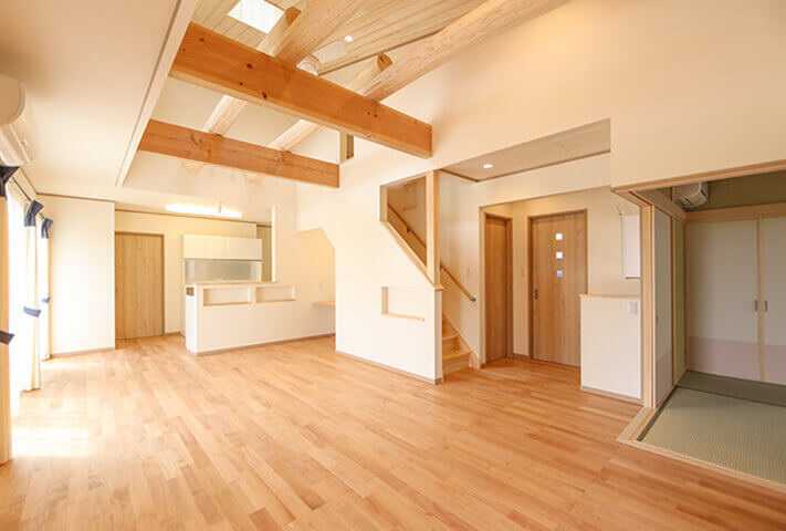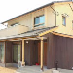 平屋ベースで和モダン、L型配置の住まい。本焼き板の黒と漆喰の白がシックな外観。中に入ると、広縁、仏間、床の間を備えた本格的和室。寝室を1Fに配置し、歳を重ねてもワンフロアーで暮らせるように将来を見据えて、終の棲家を目指した家づくり。ダイナミックな吹き抜け空間に、存在感あふれる梁丸太が見どころ。