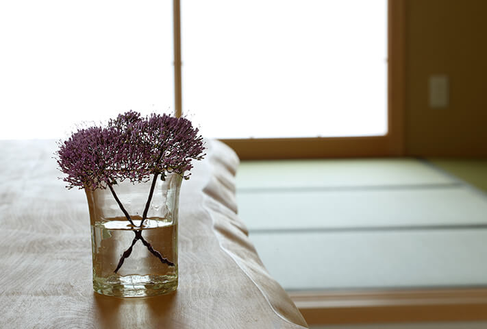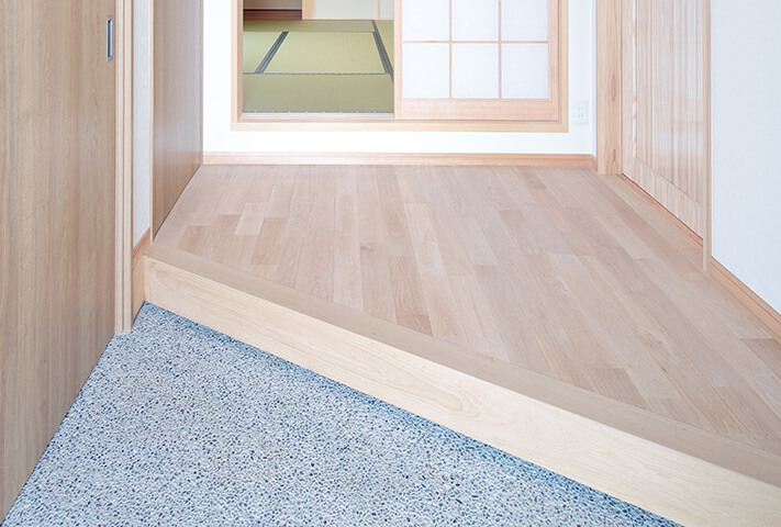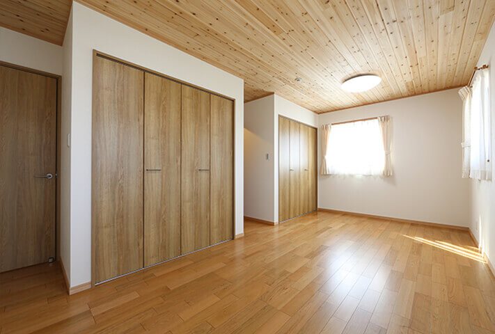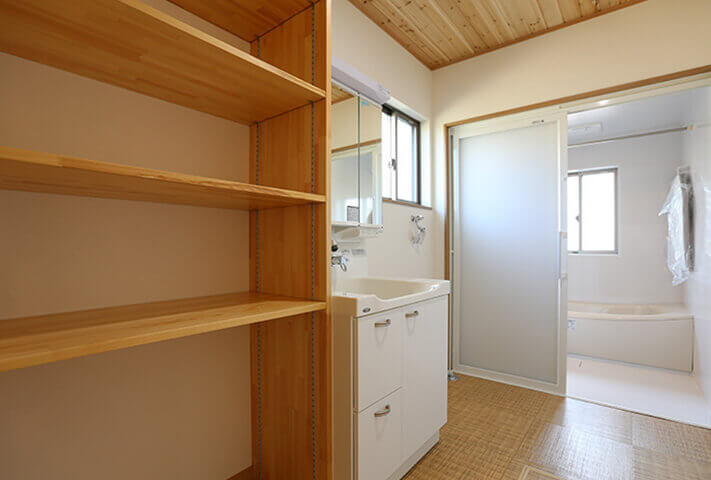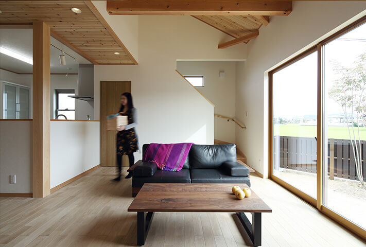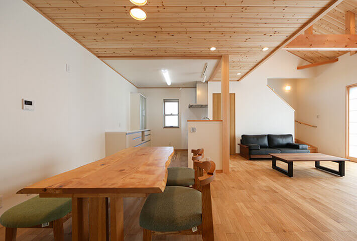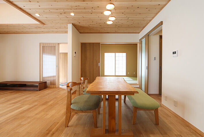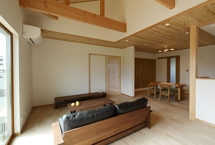 大屋根が特徴的な、漆喰の白と本焼杉の黒が映える、和モダンな佇まい。将来的にワンフロアで暮らせるようにと平屋ベースの間取り。内装は上品にまとめ、家具を個性あふれるマスターウォールに。