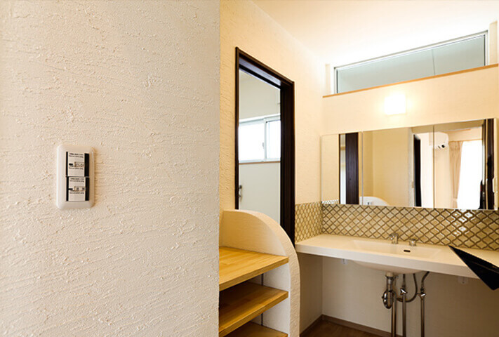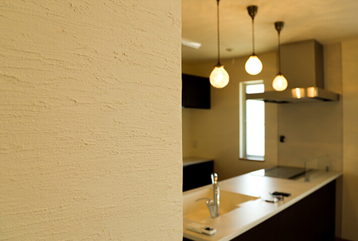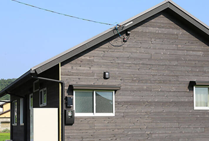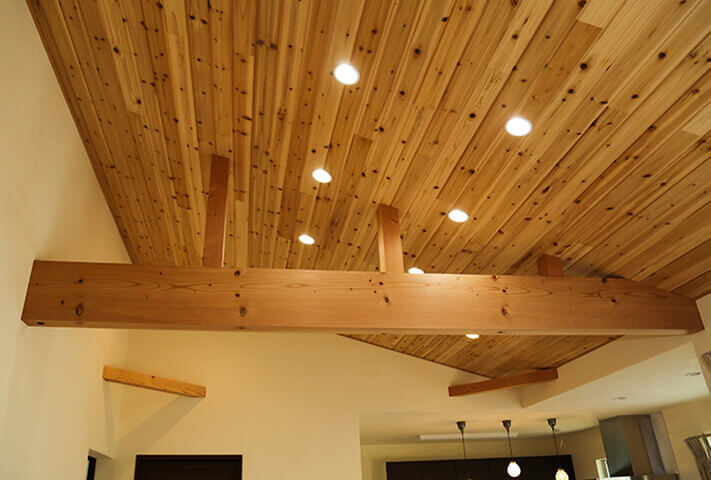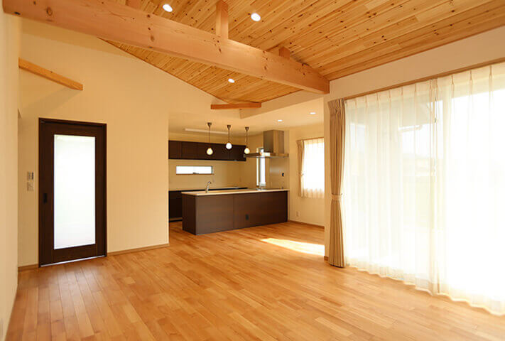 長閑な田園風景に溶け込むような、切妻大屋根の平屋。 総板貼の外観がひと際目を引く佇まい。 玄関ホールを抜けると、そこは大開口から光降りそそぐ大空間のリビング。 杉板貼りの勾配天井と塗り壁が、リビングにさらに居心地の良さを感じさせます。