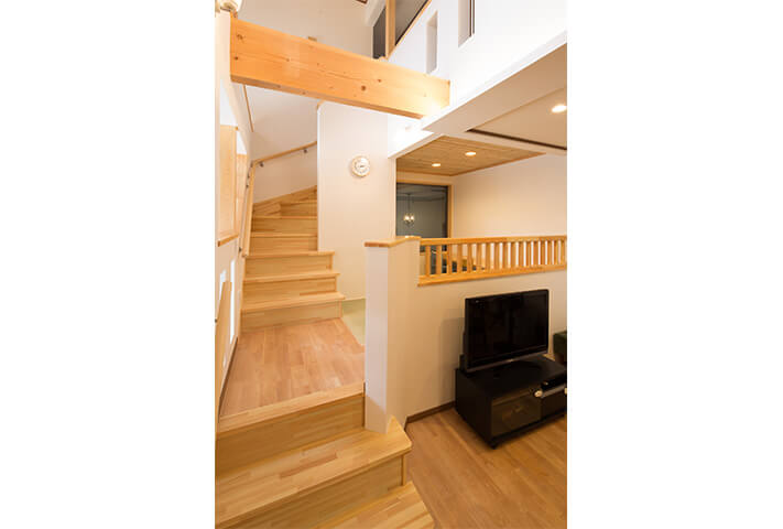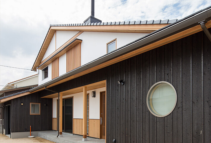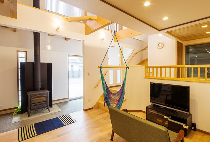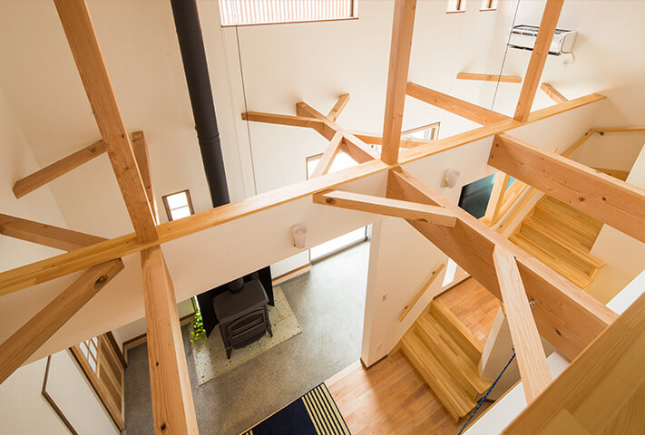 外観は大屋根に本焼き杉板と漆喰仕上げの壁、木製格子の窓。通り土間には薪ストーブ。スキップフロアからダイナミックな吹き抜けが見渡せる室内空間。