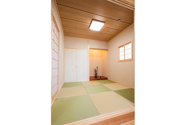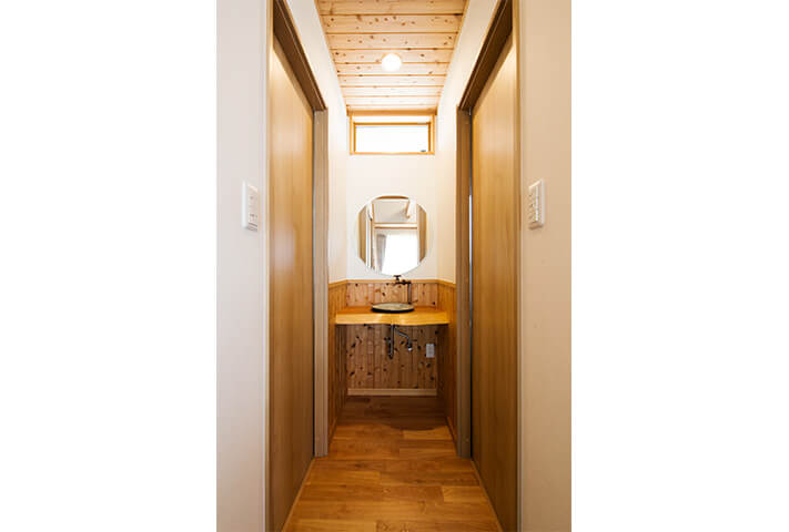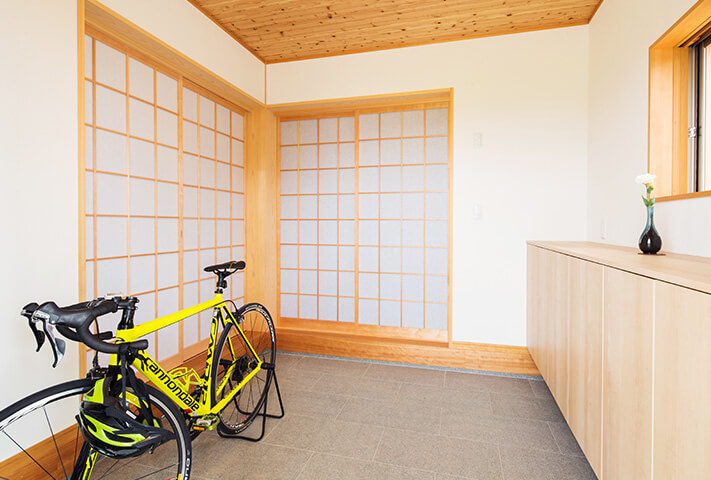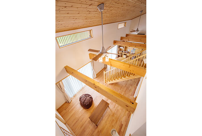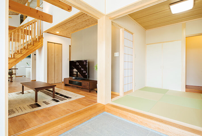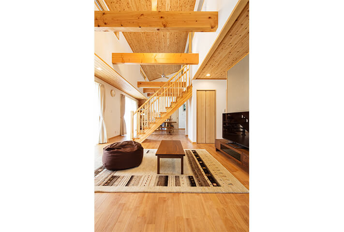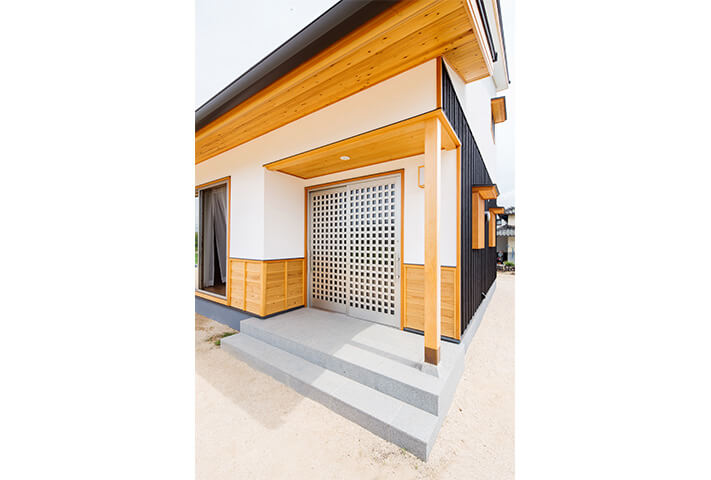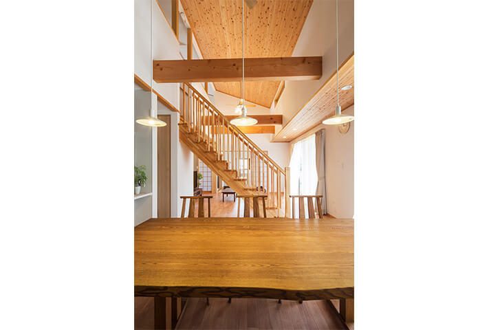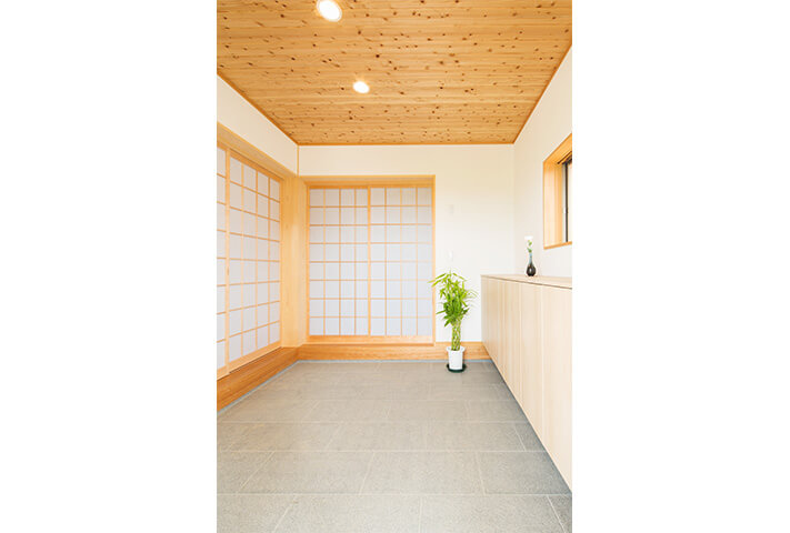 高松稲荷の大鳥居を横を抜けると、本焼き板の壁と大屋根がすてきなお宅が目を引きます。将来を見据えて、一階で完結できる暮らし。通風や動線もよく考えて計画しています。外観からは想像できにくい内部空間ですが、大きな土間玄関とそれに続くダイナミックな吹き抜け空間など平屋の魅力が満載です。