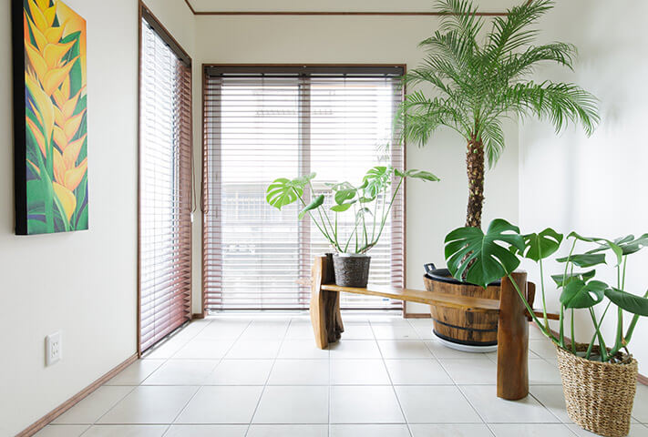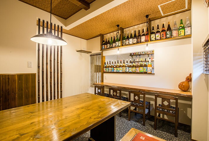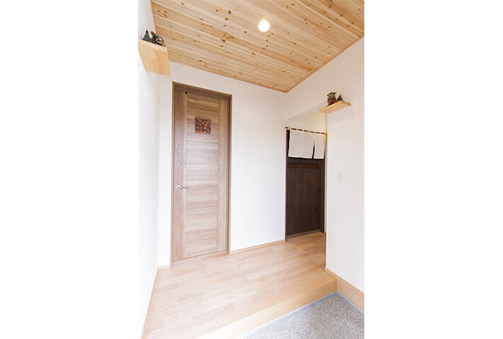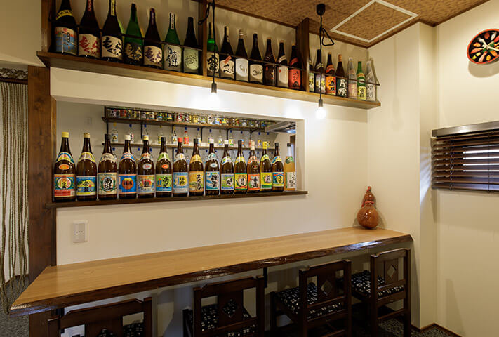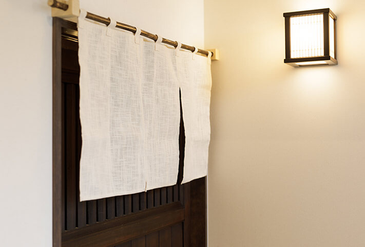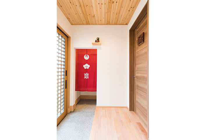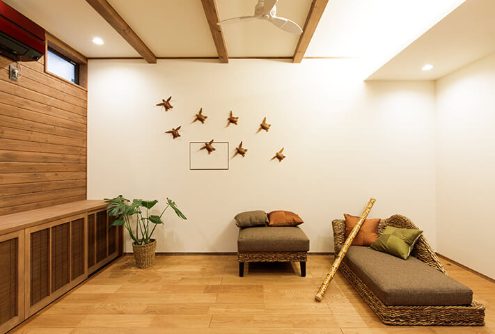 ご夫婦ともに沖縄が大好きで、奥さまの希望でリゾート風なリビング、居酒屋が大好きなご主人のご希望で、居酒屋なダイニングが両立した非常にユニークな住まいです。玄関のシーサーをはじめ、まるで小粋な居酒屋を思わせる暖簾に引き戸まで、徹底的なこだわりようでした。