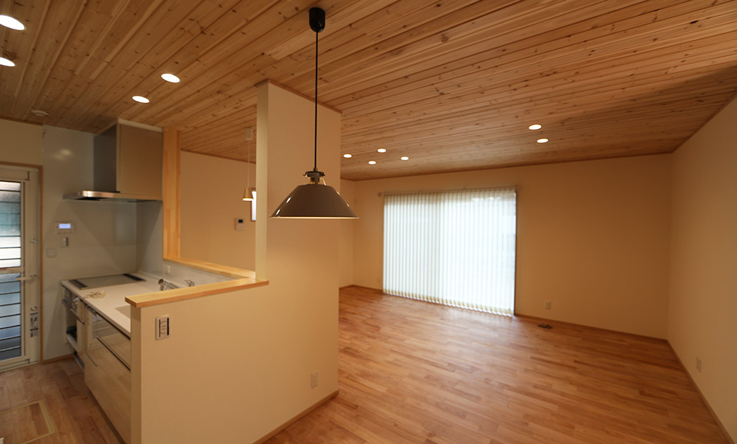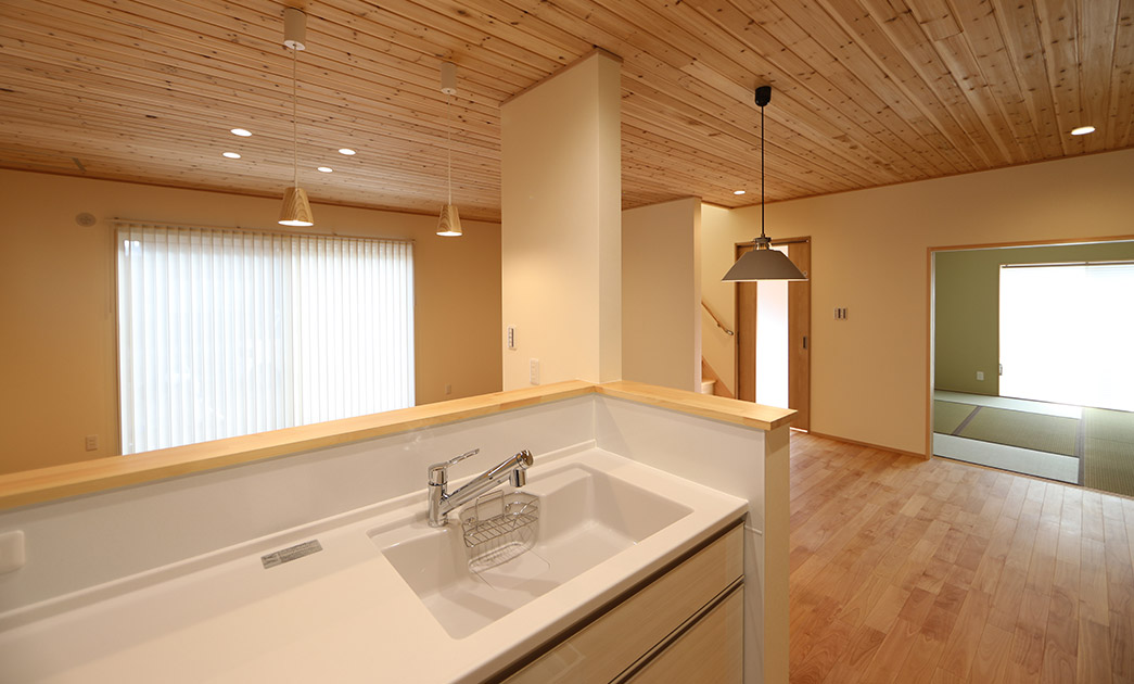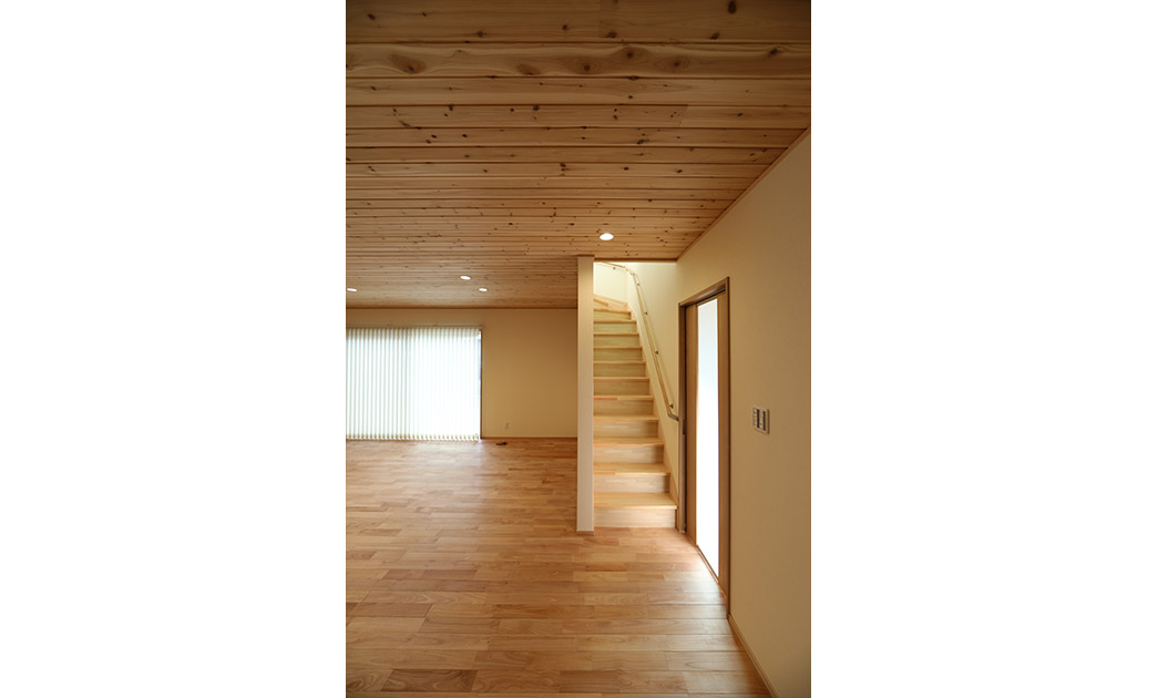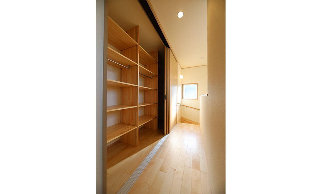 土地の取得からのお手伝い。5人家族で皆さん野球をするスポーツ一家です。バット、グローブ、遠征時の道具、ユニフォームと、それらを仕舞う大きな土間収納を玄関横に設けて専用洗濯機をも配置。寝室とウォークインクロゼットを一階に配し、将来二階を使わなくてもよいように設計しております。