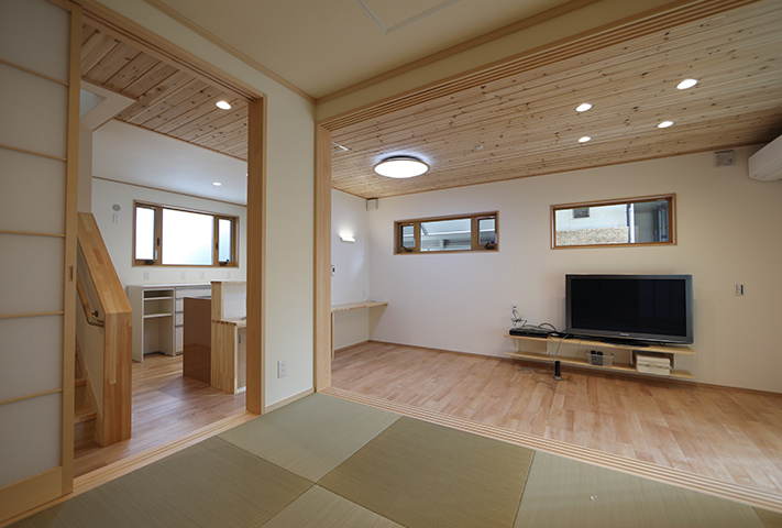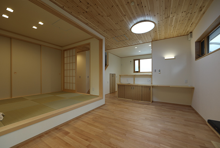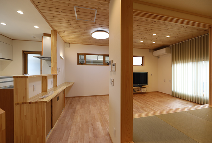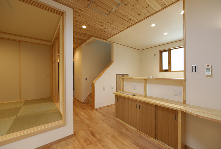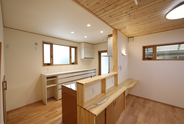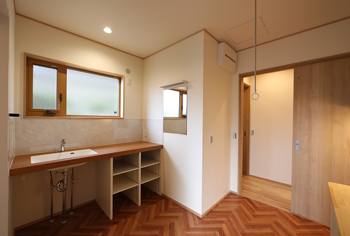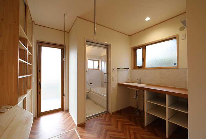 あしかけ打合せが10年。当初リフォームにしようか、建て替えにしようか、住み替えをしようかと定年後の住まい方を研究に研究を重ねて、同じ敷地に建て替えという選択肢を決断されました。建て替えとなると、仮住まいの選定から解体前のかたずけ、その他いろいろなことを仕事をしながら同時進行ですすめていくという大変さがあります。決断までに10年。それだけ想いの詰まったお宅になりました。家事動線の徹底した追及。高気密高断熱でいままでの住まいに対する寒さを含め不満をすべて解決して、なおかつそれを上回る提案をさせていただきました。私らスタッフも身内同然のような感覚になりました。特に奥様が力をつぎ込んだのが洗面脱衣と浴室、干場への動線。WICを1Fに配置したりこだわり満載になっています。