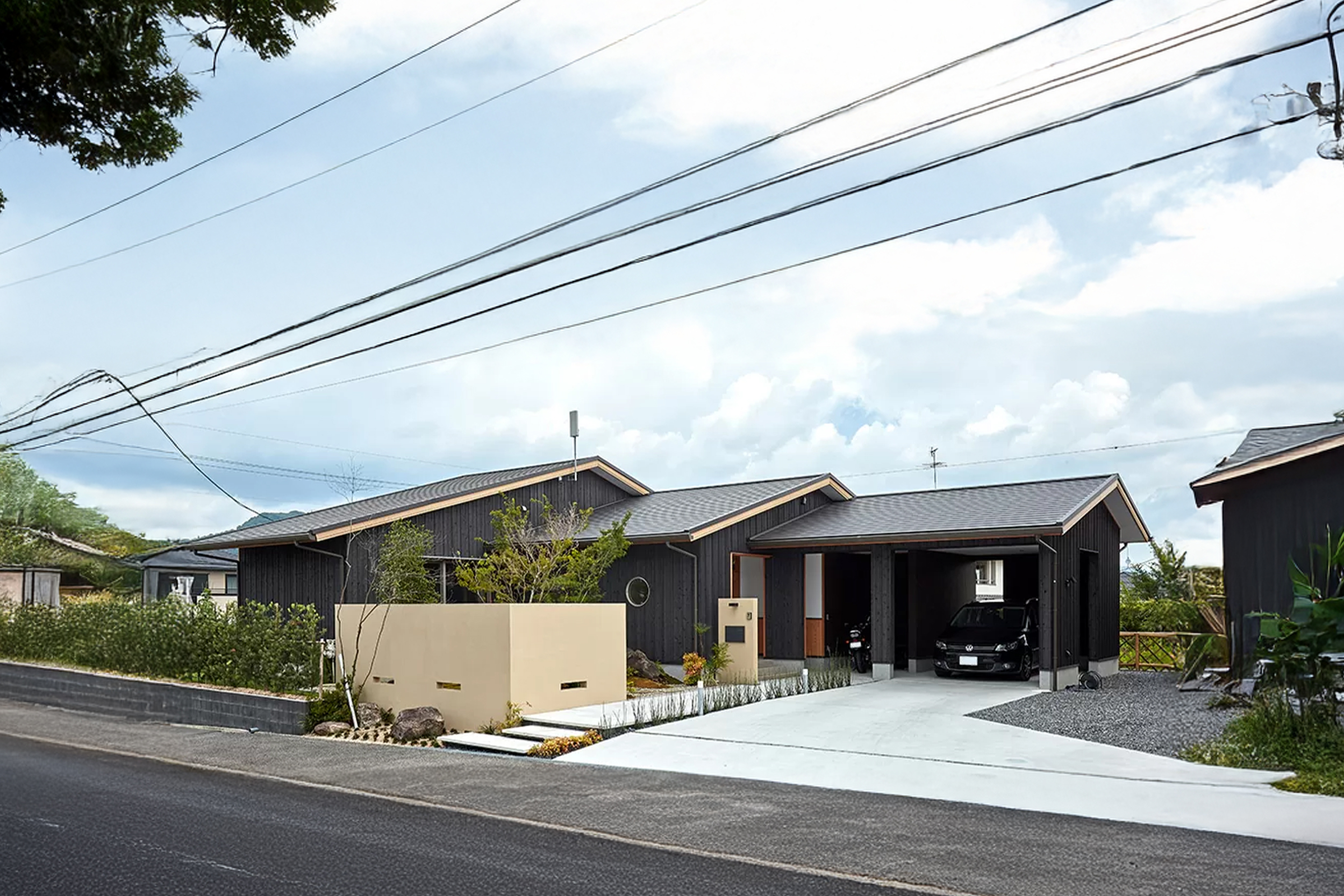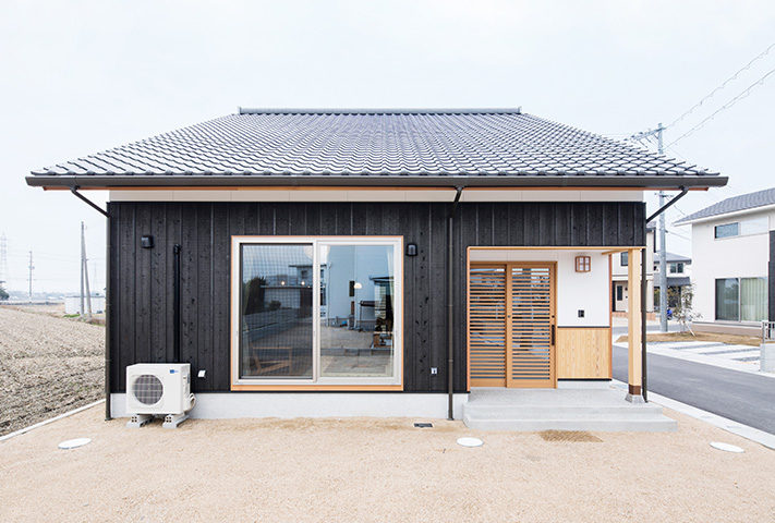 将来を見据え、一階だけで暮らせるように、「平屋ベースの二階建て」になっています。大きな屋根が特徴的で、本焼き板と倉敷格子の競演が、和の演出をしています。