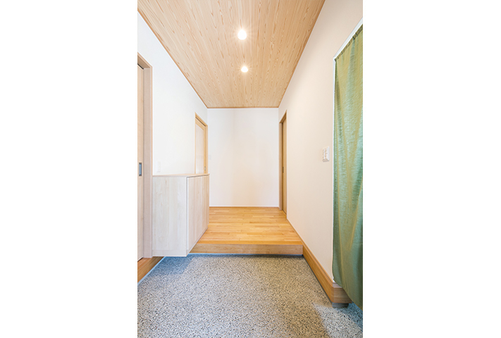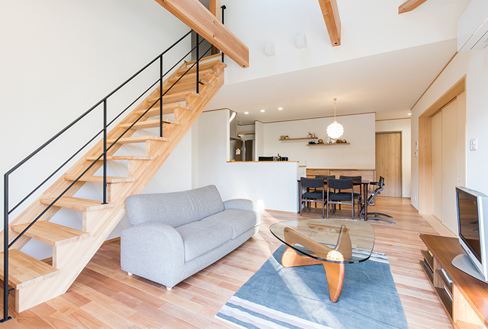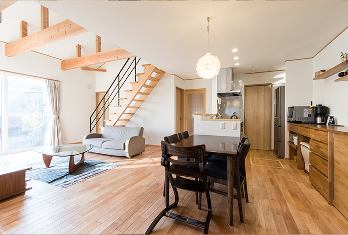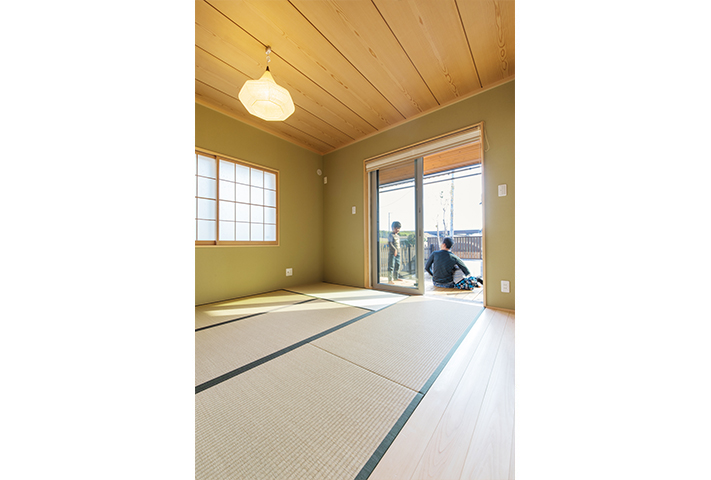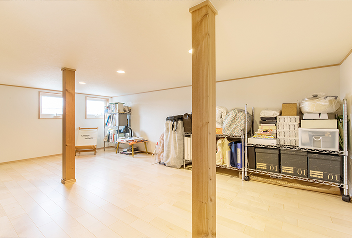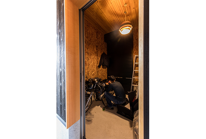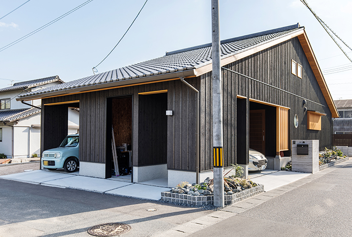 さて建物はと申しますと、随所にこだわりいっぱいです。外観は、悟りの窓を配する、弊社トレードマークの本焼き杉の外壁にダイナミックな切妻の瓦葺き。インナーガレージには車2台、バイク1台、自転車も置けます。内観は家事動線を考え抜いた間取りに、勾配吹き抜け天井のリビング。和室もあり、将来を見据えた部屋構成になっています。小屋裏収納も充実で、ハイジの小部屋を連想させます。和風でとても暮らしやすい平屋になりました。