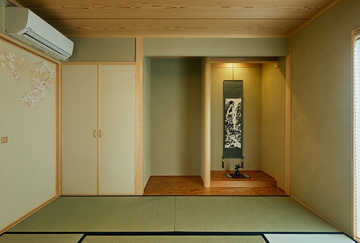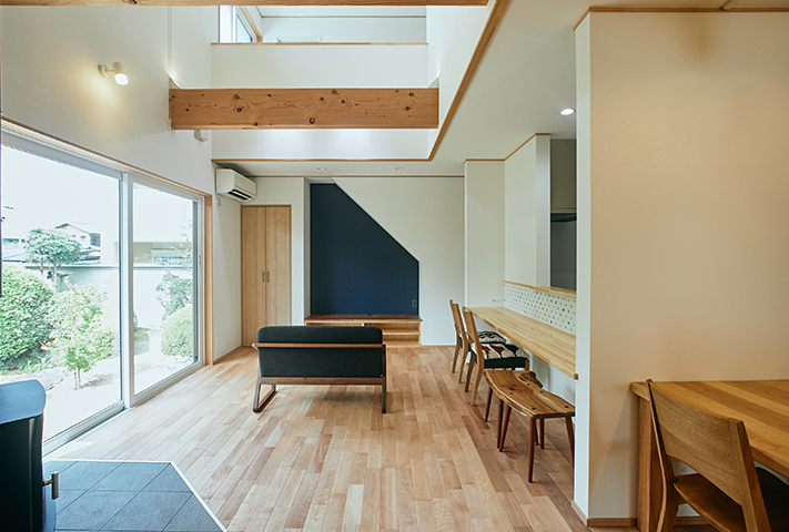 一歩中に入ると本格和室、吹き抜けのあるリビングに、イギリス製スカゲンの薪ストーブがお出迎え。