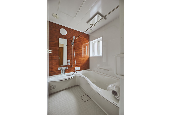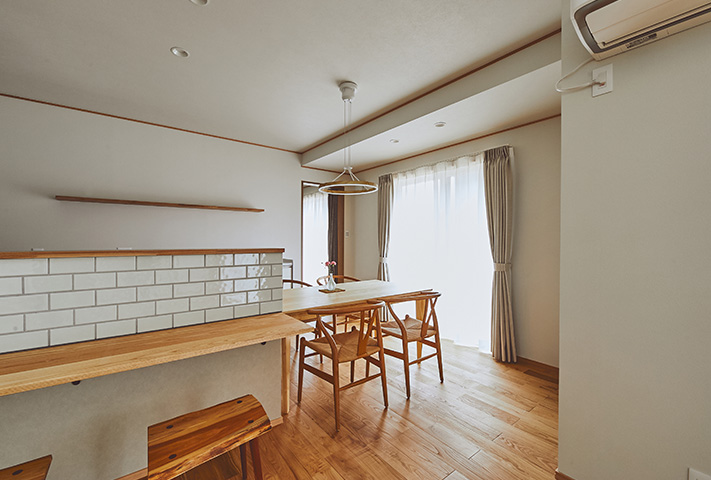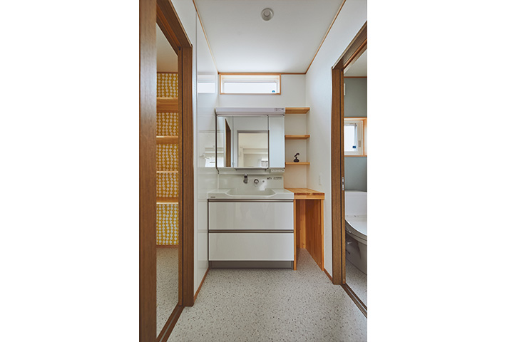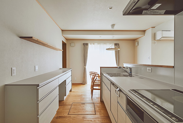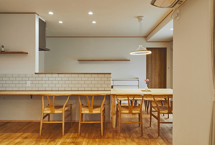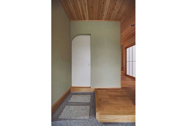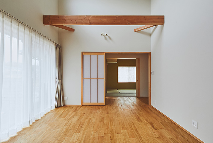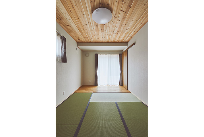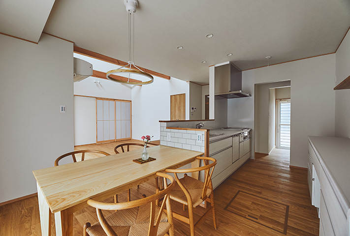 無駄のない家事動線を、間取りでフォローして、忙しい奥様のお手伝いをします。モダン和テイストの外観とはうらはらに、中に一歩入ると、土間収納、坊主ふすまで和室に誘い、リビングは北欧テイストが似合うようにさせていただきました。タイル、大谷石等アクセントに使用して、遊び心も。