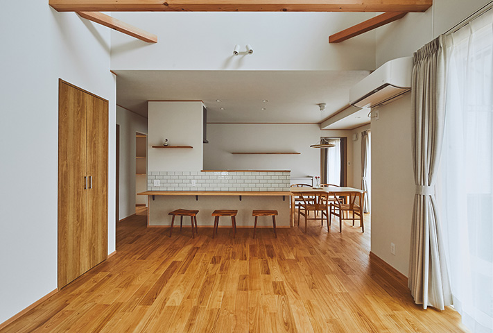 2019年9月に初めてお会いしt土地探しからのお手伝い。総社、赤磐、早島を経て船穂町柳井原でビビびときてご縁が。焼き板と大屋根が特徴的で、二階は子供部屋と図書コーナーのみで、1Fですべての生活が完結できる暮らしの提案になっています。