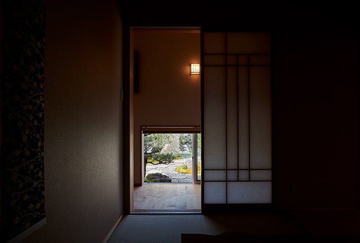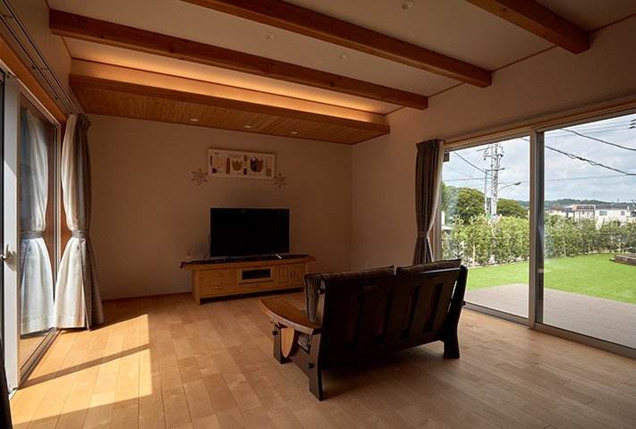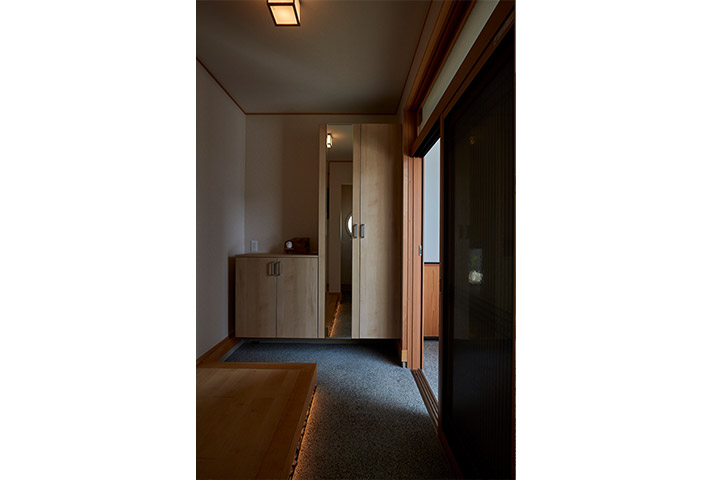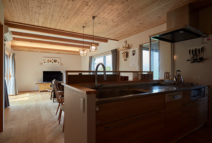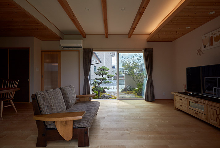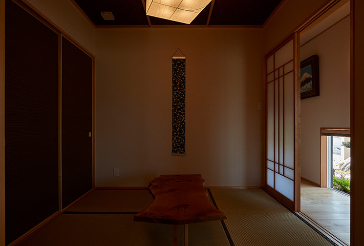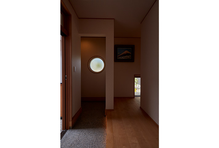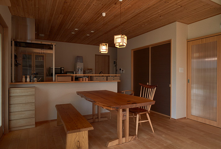 内観は、地窓がある廊下を抜けた先には、広々としたLDK、そして一枚板のテーブルが旅館のような佇まいを醸し出しています。土間収納や広い水まわり、全て引き戸を設えるなど生活のしやすさも兼ね備え、変形地をうまく利用した、≪終の棲家≫として申し分ない家づくりでした。