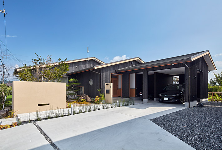 外観は、本焼き板の漆黒と特徴的な三連大屋根が美しい仕上がりに。
