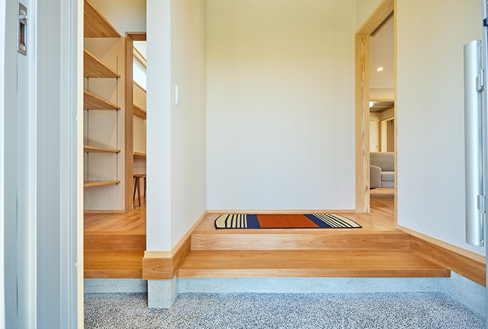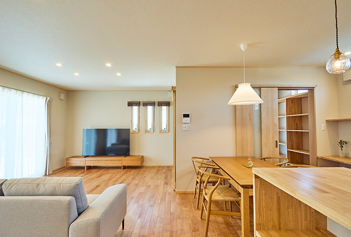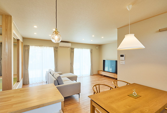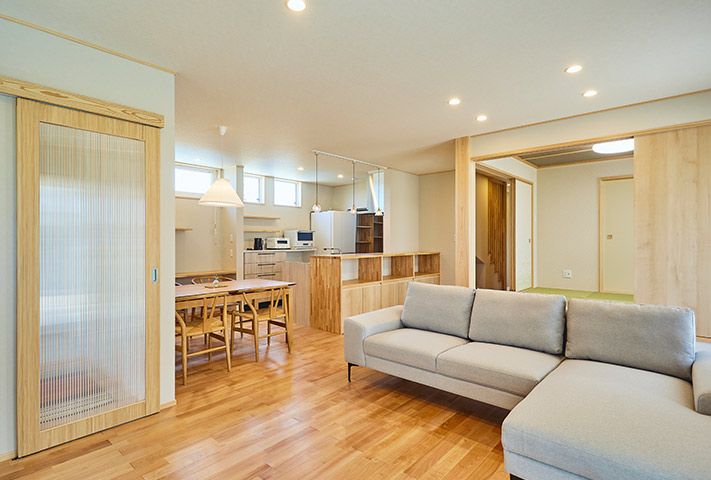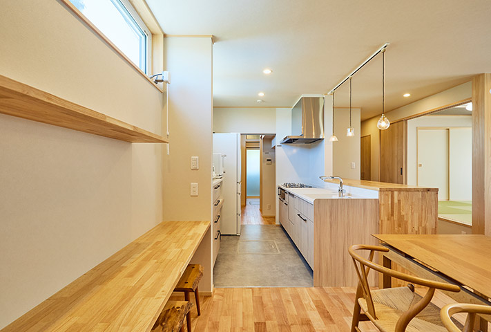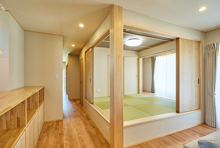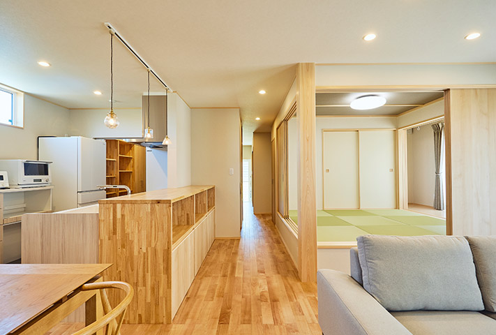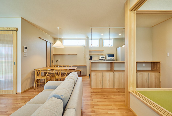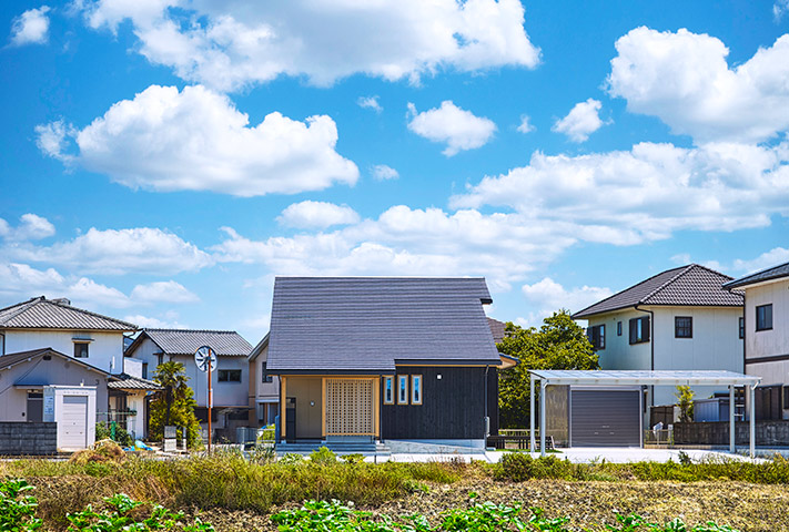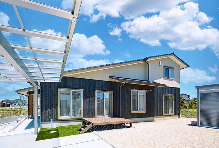 土地探しからのご相談を受け、地上げもしながら頓挫したり、色々と試行錯誤を繰り返し、3年の月日を経て完成しました。外観は一目で、おかやま住宅工房と分かる焼き板と大屋根。玄関は一般用と土間収納から出入りできる家族用に分かれています。のどかな田園風景を眺めながら暮らせるリビング。小上がりの和室がリビングに併設して昼寝に最適。回遊できるキッチンまわりと収納たっぷりのバックヤードなど、奥様の家事導線を考え抜いた水まわりを実現しました。寝室は1階に配置し、2階に上がらなくても暮らせるつくりになっています。