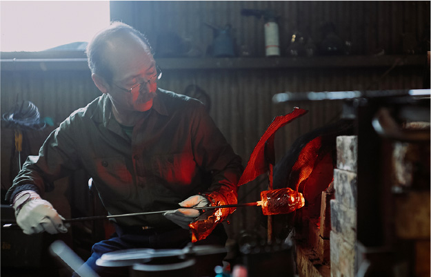 ガラスの場合、手でちょっと直すということができないから、数をたくさん吹いて感覚で覚えます。成形用の型に吹き込むんだけど、最初に作る玉の大きさが揃ってなかったら、コップの丈が伸びたり、短くなったりしてしまう。同じ大きさに揃えられるまでには、毎日一時間練習して三年はかかります。