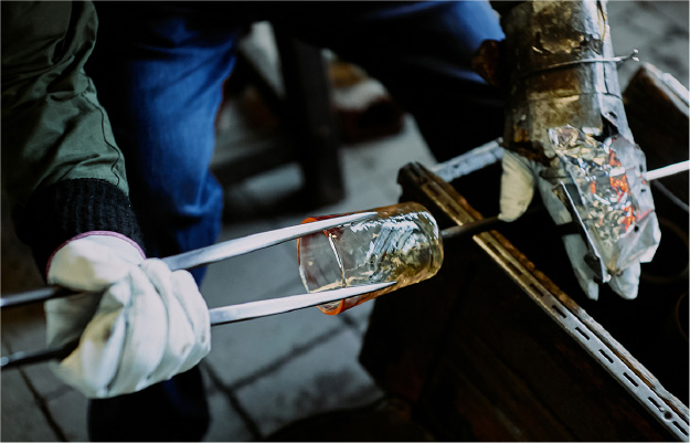 小谷 親父が青のガラスを溶かして作った最初の青色が「鮮やかすぎて民藝らしくない。」と外村先生があまりよく言わなかったんです。どうしようかと悩んでいたときに、サントリーオールドの緑色のボトルを砕いて入れてみたんです。