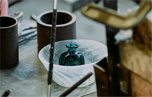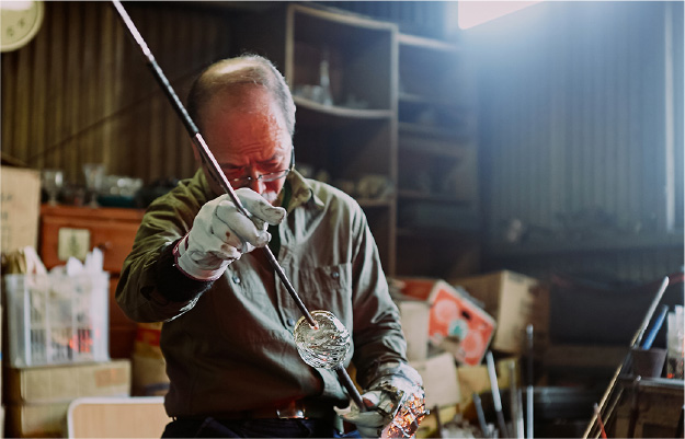 うちは小さい工房で、仕事が終わったら毎日火を落として、ガラスをかき出してというのをするから、できたんです。今日青色を作ったら次の日は薄青、その翌日には泡を入れて四日目には透明。そんな作り方も小さい窯だからこそできた訳で、それは良かったですね。