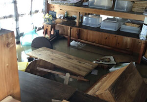 尋常でない雨が続いていたので、「もしかしたらと警戒していました。夜中の2時頃でした。家の周囲の用水が溢れて田んぼが浸かり、さらに水かさが増していったんです。あわてて両親と妻を起こして車で逃げました。岡山市に連絡を入れると、近所の小学校に避難するようにという指示でした。でも、周辺の道路が浸水していてたどりつけない。完全に孤立していました。結局、敷地全体を高くしていたパチンコ店の駐車場で朝を迎えました。そこから家のあるエリアが見えたのですが、一面海のようだったのを憶えています。その日は赤磐の妻の実家に行って一泊して、家に戻ってきたのはその翌日です。床上が40センチほど浸かっていました。水は引いていたのですが、家の土壁が浸かったところを境に、その下が全部崩れていました。家電も家具もほとんどが倒れて、部屋に散乱していました。