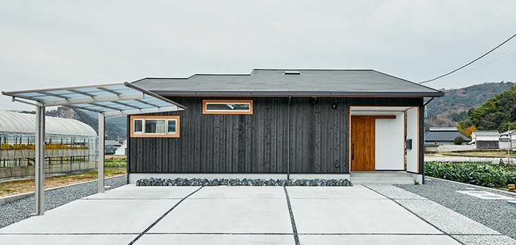 おかげさまで、2021年の4月に家は完成しました。外観は、大きな屋根と漆黒の焼き板が特徴的。期待通り、周囲の里山や田畑ののどかな風景に美しく溶けこんでくれています。いつまでも飽きることなく愛せそうだなと思いました。