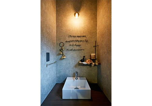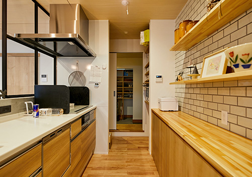 キッチンにはモルタルやタイル、アイアンといった異素材がセンスよく散りばめられています。計算された動線も非常に便利ですね。玄関から台所に直結する勝手口があるので、買い物から帰ってきてすぐに食材を冷蔵庫に入れることができます。