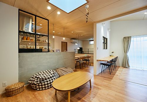 室内にも、私たちの希望とこだわりがたっぷりと詰め込まれていますね。リビングは広々としていて、実に明るい。提案してくださった天窓のおかげです。シナベニヤの天井板も、柔らかい木目が美しくて気に入っています。リビングの一角が勾配天井になっているのも、広さを感じさせてくれる要因でしょうか。