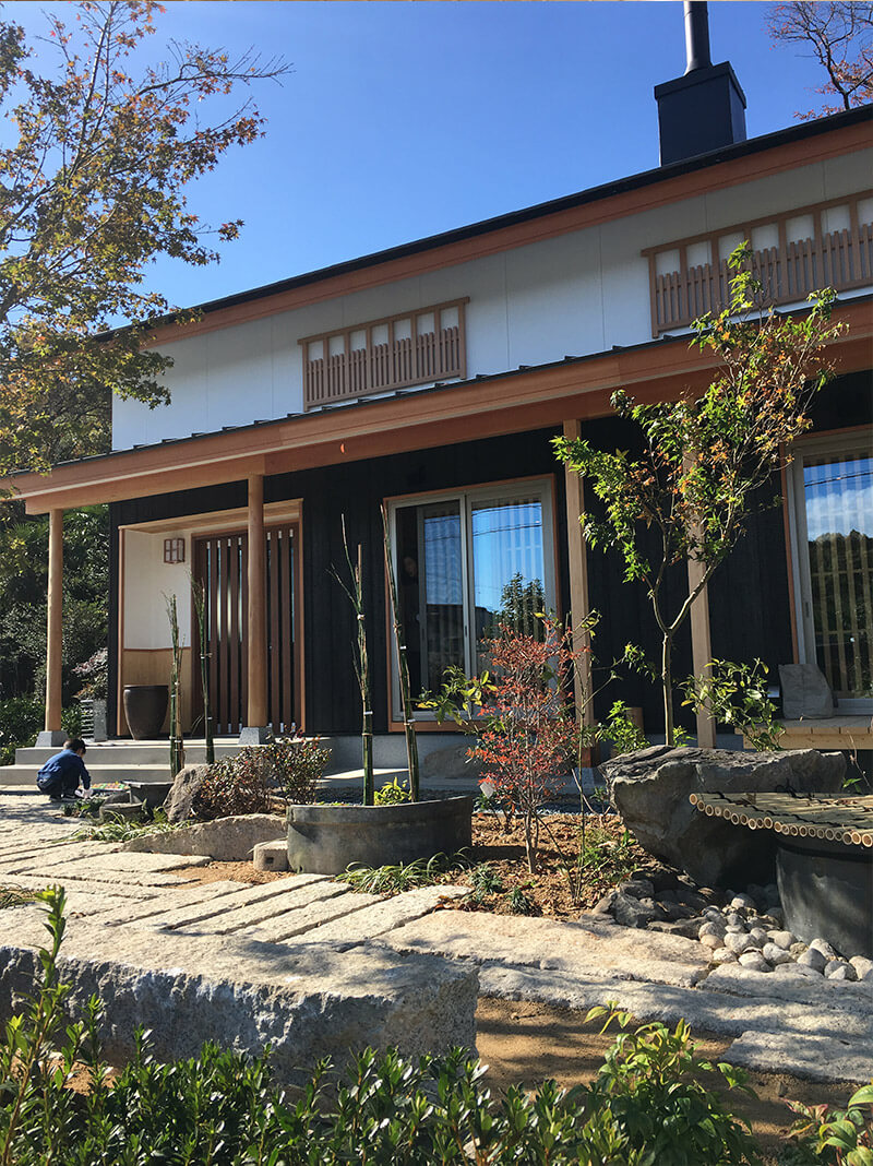 白と黒の外観、深く出た軒。素敵な外構との融合。