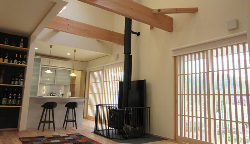 リビングは勾配天井の豊かな空間に、バーモントキャスティングの薪ストーブが粋な空間を演出しています。